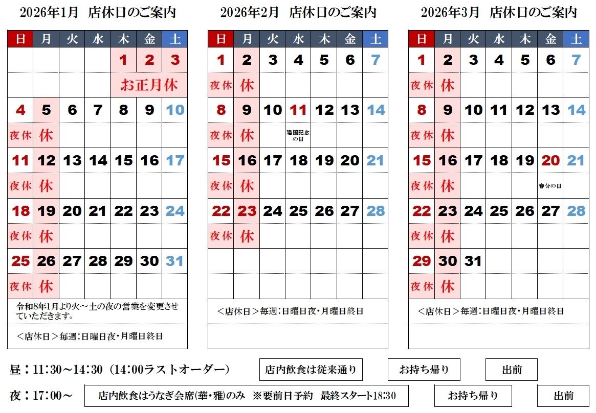 | 営業時間 | 11:30〜14:30(OS14:00)・17:00〜 店内飲食はうなぎ会席(華・雅)のみ※要前日予約 |